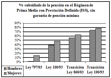 Los estudios económicos demostraban que de continuar aplicándose la Ley 100 de 1993, sin realizar los ajustes fiscales del caso, el Estado tendría que subsidiar con sus propios recursos el 39% de las pensiones de los hombres y el 48% de las mujeres. En la actualidad, con la reforma de la Ley 797 de 2003, a partir de la adopción de medidas sobre las variables que componen el cálculo actuarial, y modificando en menor medida los beneficios pensionales y la composición del presupuesto, el porcentaje que debe subsidiar el Estado se redujo drásticamente en un 1% en caso de los hombres y en un 15% en tratándose de mujeres. El presente gráfico aportado por el Ministerio de Hacienda y Crédito Público, refleja dicha realidad económica: