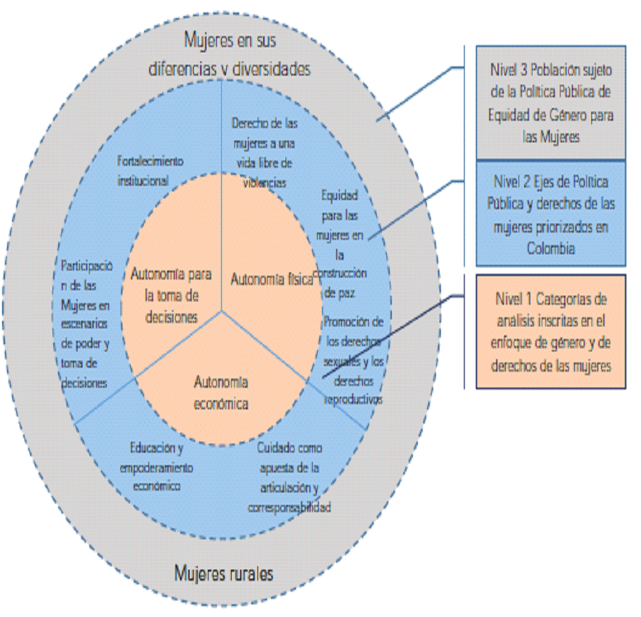 Es así como este documento CONPES plantea acciones dirigidas a: (i) Aumentar las oportunidades de autonomía económica para las mujeres desde diversos ámbitos, eliminando las barreras aún existentes y dando continuidad a las políticas adelantadas en este ámbito; (ii) Avanzar hacia la paridad en participación de las mujeres en los cargos de elección popular, cargos directivos del sector público a nivel nacional y territorial y su liderazgo en el escenario comunal; (iii) Generar intervenciones públicas que mejoren la salud física y mental de las mujeres; (iv) Fortalecer la política para prevenir y atender de manera integral las violencias contra las mujeres; (v) Afianzar el rol de las mujeres en la construcción de paz y la agenda de seguridad en el marco de la Resolución 1325; (vi) fortalecer la institucionalidad para la transversalización del enfoque de género en asuntos estratégicos del Estado y transformación cultural. Todas estas con un énfasis en la situación de las mujeres rurales.