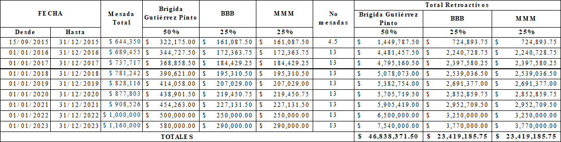 El retroactivo pensional causado hasta el 31 de diciembre de 2023 arroja la suma de $46.838.371,50 para la cónyuge supérstite y la suma de $23.419.198,75 para cada uno de los hijos BBBB y MMMM, como se indica y liquida en el cuadro siguiente: