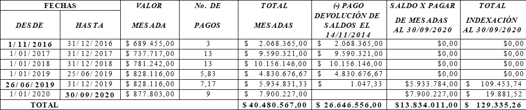 En tal dirección, el retroactivo de la prestación al 30 de septiembre de 2020 asciende a $40´480.567,00, al cual se le debe deducir la suma de $26´646.556 pagada por concepto de devolución de saldos y bono pensional, lo que arroja como resultado el valor de $13´834.011,00. Asimismo, la indexación de este último equivale a $129.335,26. Todo lo anterior se relaciona en el siguiente cuadro: