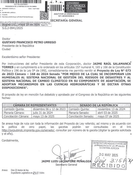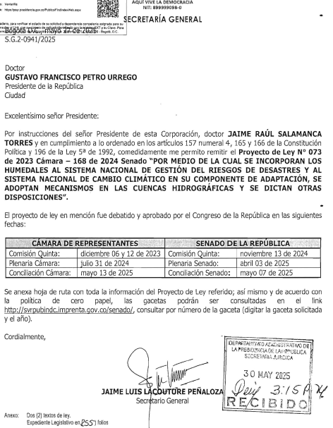 El Gobierno nacional sin la correspondiente sanción ejecutiva, se permite devolver por razones de inconstitucionalidad e inconveniencia el Proyecto 073 de 2023 Cámara, 168 de 2024 Senado, por medio de la cual se incorporan los humedales al sistema nacional de gestión del riesgo de desastres y al sistema nacional de cambio climático en su componente de adaptación, se adoptan mecanismos en las cuencas hidrográficas y se dictan otras disposiciones.