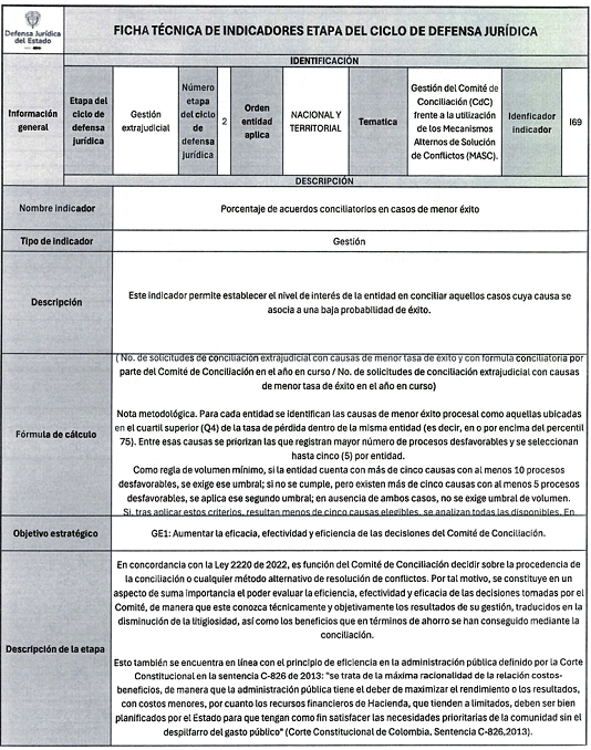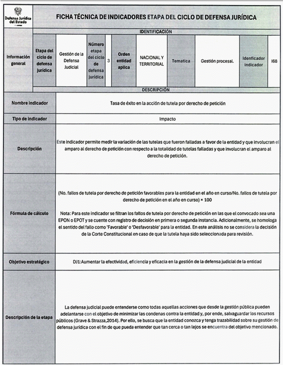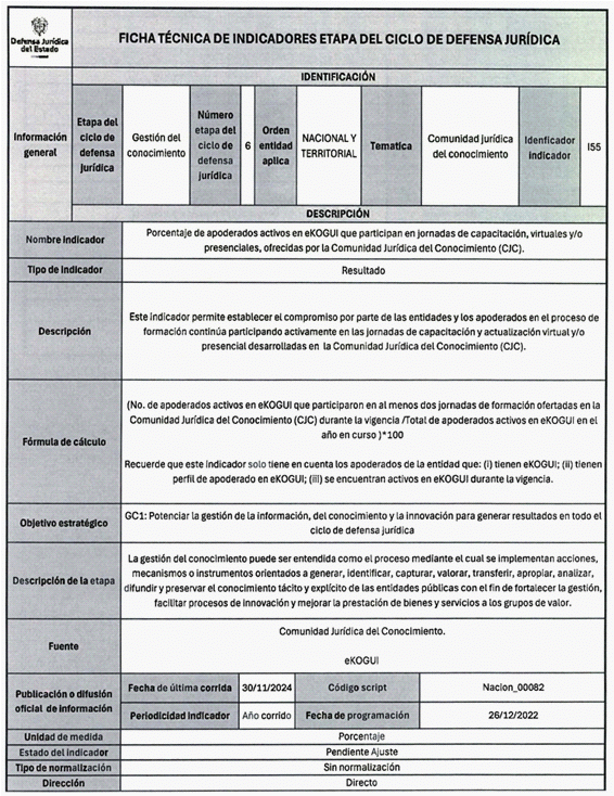 6. Los veinticuatro (24) indicadores de esta medición se distribuyen también en las distintas etapas del Ciclo de Defensa Jurídica del Estado, así: (i) tres (03) indicadores en la etapa de gestión del conocimiento, (ii) cuatro (04) en prevención del daño antijurídico, (iii) cuatro (04) en gestión extrajudicial, (iv) siete (07) en gestión de la defensa judicial, (v) cuatro (04) en gestión del cumplimiento de créditos judiciales y (vi) dos (02) en gestión de los mecanismos para la protección y recuperación del patrimonio público.