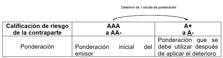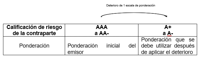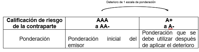 d) Tratándose de países con calificación soberana de largo plazo entre BB+ y B- se debe utilizar la ponderación de riesgo deteriorando una escala de ponderación a la que resulte aplicable a la contraparte, de conformidad con el artículo 2.9.1.1.11 del Decreto 2555 de 2010. A continuación, se presenta una ilustración de cómo sería el caso en el que una contraparte estuviera calificada por riesgo en AAA.