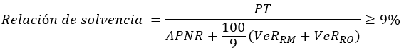 La relación de solvencia de las SF se define como el valor del patrimonio técnico calculado de acuerdo con lo dispuesto en el numeral 2 del presente Capítulo, dividido por la sumatoria de los activos ponderados por nivel de riesgo crediticio, cien novenos (100/9) del valor de la exposición por riesgo de mercado y cien novenos (100/9) del valor de la exposición al riesgo operacional. Esta relación se expresa en términos porcentuales. La relación de solvencia mínima de las SF será del nueve por ciento (9%).