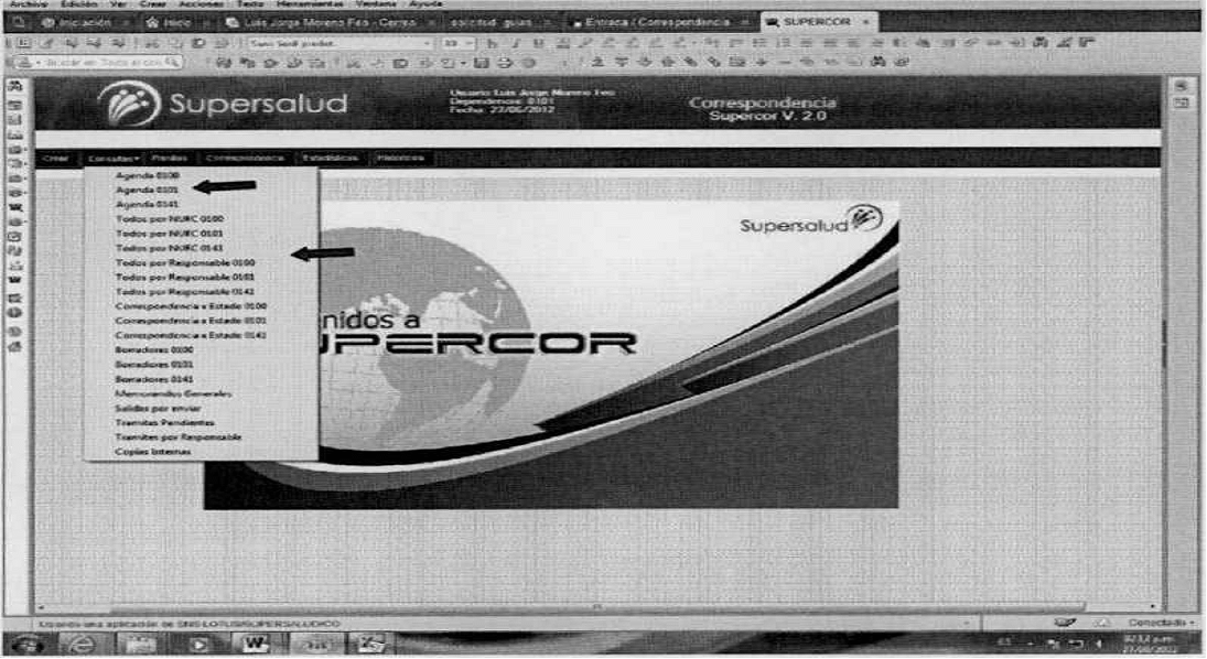 Ingreso al aplicativo SUPERCOR, y en la barra de funcionalidades, realice click en el botón “CONSULTAS”, donde se desplegarán diferentes opciones, donde podrá seleccionar la opción; ''Agenda + (Código dependencia)" y luego la opción "Todos por Responsable + (Código dependencia)":