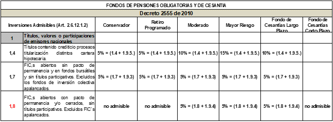 Ø En su numeral 1. se encuentran los “Títulos, valores o participaciones de emisores nacionales”, en su subnumeral 1.8. se establecen los FIC cerrados para títulos de deuda y el límite para los mismos, de acuerdo con el tipo de fondo, está definido en los artículos 2.6.12.1.5 para el Fondo Conservador, 2.6.12.1.6 para el Fondo Moderado, 2.6.12.1.7 para el Fondo de Mayor Riesgo, 2.6.12.1.8. para el Portafolio de Largo Plazo del Fondo de Cesantía y el 2.6.12.1.9 para el Portafolio de Corto Plazo del Fondo de Cesantía, como se puede observar en el siguiente cuadro: