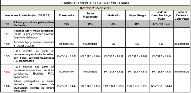 - En el numeral 1.9 del artículo 2.6.12.1.2 se encuentran distribuidos los títulos y/o valores participativos de emisores nacionales, y sus respectivos límites de inversión están definidos en los artículos mencionados para cada tipo de fondo. Para esta clase de activos, el subnumeral 1.9.4. incorpora los FIC cerrados para títulos participativos, así: