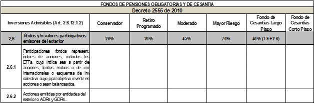 - En el numeral 2.6 del artículo 2.6.12.1.6 de inversiones admisibles, se determinan las inversiones en “Títulos y/o valores participativos para los emisores del exterior”, para los cuales se establece un único límite de inversión por tipo de fondo. Lo anterior se puede ver con mayor claridad en el siguiente cuadro: