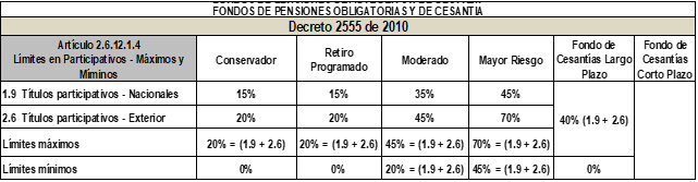 - Así mismo, en el Artículo 2.6.12.1.4, se establecen los límites de inversión máximos y mínimos en títulos y/o valores participativos para la sumatoria de los activos tanto nacionales como del exterior, por tipo de fondo de pensiones obligatorias, como se observa en el siguiente cuadro: