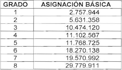 PARÁGRAFO 1o. En la escala de asignación básica fijada en el presente artículo la primera columna señala los grados de remuneración y la segunda indica la asignación básica mensual establecida para cada grado.