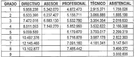 PARÁGRAFO 1o. En las escalas de asignaciones básicas de que trata el presente artículo, la primera columna señala los grados que corresponden a las distintas denominaciones de empleos, la segunda y siguientes determinan las asignaciones básicas mensuales para cada grado y nivel.