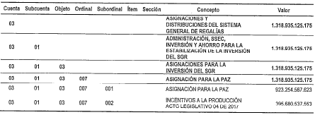 2. De los recursos incorporados en el numeral anterior, destínese la suma de UN BILLÓN TRESCIENTOS DIECIOCHO MIL NOVECIENTOS TREINTA Y CINCO MILLONES CIENTO VEINTICINCO MIL CIENTO SETENTA Y CINCO PESOS MONEDA LEGAL ($1.318.935.125.175), a la Asignación para la Paz y a incentivar la producción de municipios en cuyos territorios se exploten los recursos naturales no renovables y a los municipios y distritos con puertos marítimos y fluviales por donde se transporten dichos recursos o derivados de los mismos, en cumplimiento del parágrafo 7o. transitorio del artículo 2o. del Acto Legislativo 04 de 2017 que modifica el artículo 361 de la Constitución Política y el parágrafo 2o. del artículo 57 de la Ley 2056 de 2020, según el siguiente detalle: