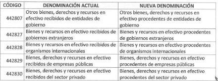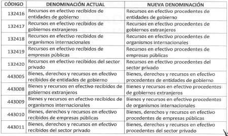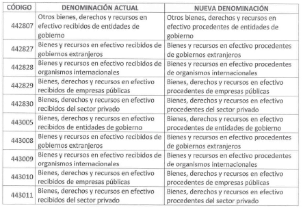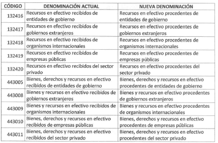 ARTÍCULO 1o. Modificar la denominación de las siguientes subcuentas del Catálogo General de Cuentas del Marco Normativo para Entidades de Gobierno: