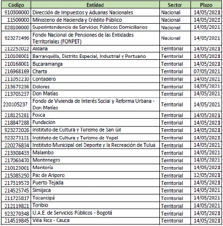 ARTÍCULO 1o. Prorrogar el plazo indicado en el artículo 16 de la Resolución número 706 de diciembre 16 de 2016 y sus modificaciones para la presentación de la información financiera a través del Sistema Consolidador de Hacienda e Información Financiera Pública - CHIP, de la categoría Información Contable Pública - Convergencia correspondiente al período enero - marzo de 2021, para las siguientes entidades de gobierno, así: