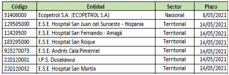 ARTÍCULO 2o. Prorrogar el plazo de presentación de la información financiera, a través del sistema CHIP, indicado en el artículo 16 de la Resolución número 706 de diciembre 16 de 2016 y sus modificaciones, para la categoría Información Contable Pública - Convergencia, correspondiente al período enero-marzo de 2021, para las siguientes empresas, así: