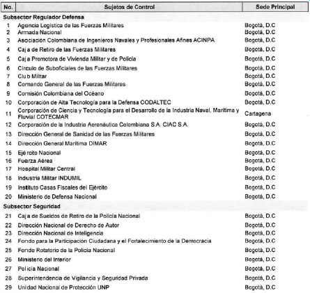 ARTÍCULO 5o. CONTRALORÍA PARA EL SECTOR DEFENSA Y SEGURIDAD. <Resolución derogada por el artículo 33 de la Resolución REG-EJE-0093 de 2021> La Contraloría Delegada para el Sector Defensa y Seguridad será competente para ejercer la vigilancia y el control fiscal a los siguientes sujetos de control: