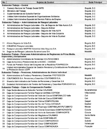 ARTÍCULO 14. CONTRALORÍA DELEGADA PARA EL SECTOR TRABAJO. <Resolución derogada por el artículo 33 de la Resolución REG-EJE-0093 de 2021> La Contraloría Delegada para el Sector Trabajo será competente para ejercer la vigilancia y el control fiscal a los siguientes sujetos de control: