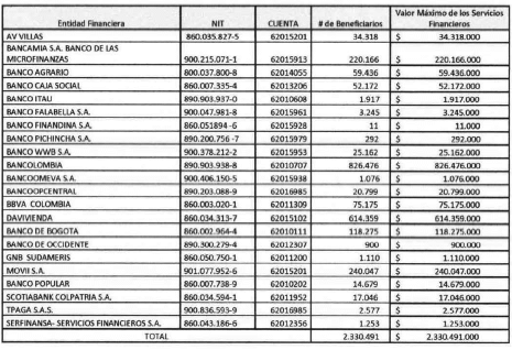 PARÁGRAFO 1o. Los recursos serán consignados en la cuenta de depósito (CUD) del Banco de la República que la entidad financiera indicó de acuerdo con la anterior tabla.