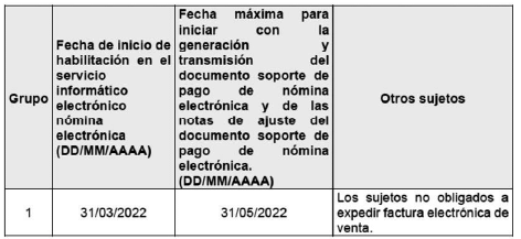 | Grupo | Fecha de inicio habilitación en el servicio informático electrónico nómina electrónica (DD/MM/AAAA) | Fecha máxima para iniciar con la generación, transmisión del documento soporte de pago de nómina electrónica y de las notas de ajuste del documento soporte de pago de nómina electrónica. (DD/MM/AAAA) | Intervalo en relación con el número de empleados | |