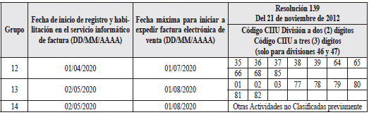 a) Grupo: Corresponde al orden en que los sujetos obligados a expedir factura electrónica de venta, deben cumplir con las fechas indicadas para la fase de registro y habilitación en el servicio informático electrónico de validación previa de factura electrónica y expedición de la misma.
