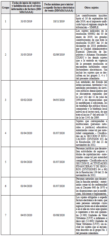 “Artículo 3o. Calendario de implementación de la factura electrónica de venta. Los sujetos obligados a expedir factura electrónica de venta conforme lo indica el artículo 2o de esta resolución, deberán cumplir con la obligación de expedir factura electrónica de venta, teniendo en cuenta los siguientes calendarios de implementación: