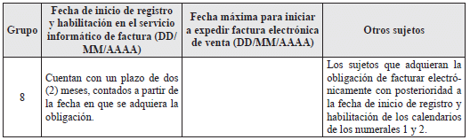 Los sujetos obligados a expedir factura electrónica de venta que deban cumplir con lo indicado para los grupos 3 al 7 del calendario establecido en el numeral 2, podrán contar con dos (2) meses adicionales a partir de la fecha máxima para iniciar a expedir factura electrónica de venta.