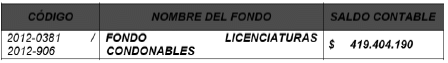 Es necesario precisar que los CUATROCIENTOS DIECINUEVE MILLONES CUATROCIENTOS CUATRO MIL CIENTO NOVENTA PESOS ($419.404.190) M/ CTE., correspondientes al Fondo de Licenciaturas Condonables en Liquidación 2012-0381 / 2012-906, se derivan del documento de ejecución de recursos con corte al 31 de diciembre de 2019 y a la información de rendimientos no reintegrados informada por el área contable con corte al 31 de mayo de 2020. Por lo anterior, nos permitimos ratificar que el valor total a incorporar en el presupuesto del Fondo Solidario para la Educación corresponde a la suma de CUATROCIENTOS DIECINUEVE MILLONES CUATROCIENTOS CUATRO MIL CIENTO NOVENTA PESOS ($419.404.190) M/Cte., valor que debe ser utilizado en el Plan de Auxilios Educativos Coronavirus COVID-19 conforme a lo dispuesto en el ya mencionado decreto legislativo, provenientes del Fondo de Licenciaturas Condonables en Liquidación 2012-0381 / 2012-906.