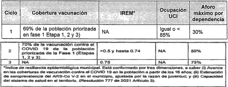 El ciclo en el que se encuentra la ciudad de Bogotá, D. C. es definido de acuerdo con el nivel de avance en el Plan Nacional de Vacunación etapas 1, 2 y 3 de la fase 1 y, el índice de resiliencia epidemiológica municipal, el cual, será publicado el día uno y día quince de cada mes en el Repositorio Institucional Digital -R10- del Ministerio de Salud y Protección Social.