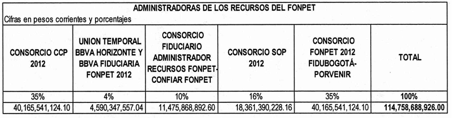 Que, mediante Resolución número 3252 del 24 de octubre de 2012, se adjudicó la Licitación Pública No. 06 de 2012, a las siguientes entidades administradoras del Fondo Nacional de Pensiones de las Entidades Territoriales (Fonpet): el 35% de los recursos al CONSORCIO CCP 2012, integrado por Fiduciaria La Previsora S.A., y Fiduciaria Cafetera S. A.(hoy Fiduciaria Davivienda S. A.); el 35% de los recursos al CONSORCIO FONPET 2012 FIDUBOGOTÁ-PORVENIR, integrado por la Sociedad Administradora de Fondos de Pensiones y Cesantías Porvenir S.A. y Fiduciaria Bogotá S. A.; el 16% de los recursos al CONSORCIO SOP 2012, integrado por Fiduciaria de Occidente S.A., Fiduciaria Popular S.A. y Skandia Sociedad Fiduciaria S.A.; el 10% de los recursos al CONSORCIO FIDUCIARIO ADMINISTRADOR RECURSOS FONPET CONFIAR FONPET, integrado por Helm Fiduciaria S.A. (hoy Itau Asset Management) y Fiduciaria Colombiana de Comercio Exterior S.A.; y el 4% de los recursos a la UNIÓN TEMPORAL BBVA HORIZONTE Y BBVA FIDUCIARIA FONPET 2012, integrado por BBVA Horizonte Sociedad Administradora de Fondos de Pensiones y Cesantías S.A. (hoy Sociedad Administradora de Fondos de Pensiones y Cesantías Porvenir S.A.) y BBVA Fiduciaria S.A.