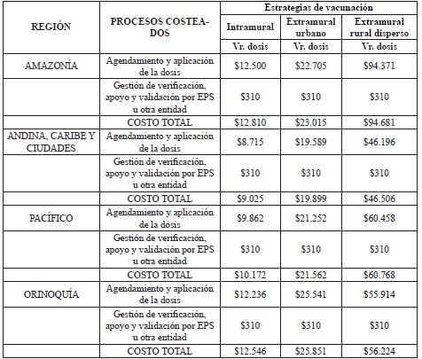 Con base en las anteriores consideraciones se obtuvo el valor unitario por aplicación en cada región y para cada una de las estrategias de vacunación (cuadro de valores unitarios de reconocimiento y pago), que incluye la estimación de los elementos y ajustes del costo descritos a lo largo de este anexo al igual que el valor por dosis destinado al reconocimiento de la gestión de verificación, control y validación que deben realizar las entidades del aseguramiento o quienes hagan sus veces en este proceso.