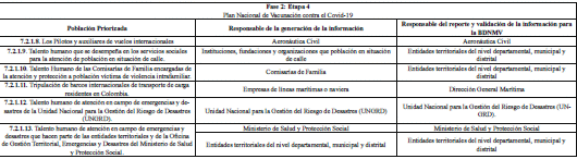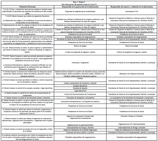 Que, la citada norma establece que, el Plan Nacional de Vacunación está integrado por 2 fases y 5 etapas, y que este Ministerio será el encargado de identificar las personas a vacunar en cada etapa, así como de conformar gradualmente la Base de Datos Maestra de Vacunación Nominal, de acuerdo con la información contenida en las bases de datos oficiales con las que cuenta el Estado colombiano y aquellas que estén disponibles; así mismo dispuso que para la identificación nominal de algunos grupos poblacionales priorizados de los cuales el Ministerio no disponga de información, este solicitará a las entidades públicas o privadas la entrega de la información correspondiente, mediante los mecanismos electrónicos que defina, precisando que la completitud, oportunidad y calidad de los datos suministrados por esas entidades será responsabilidad de las mismas, quienes deberán disponer de un mecanismo de consulta para que la población pueda solicitar la revisión de su caso, si lo considera necesario.