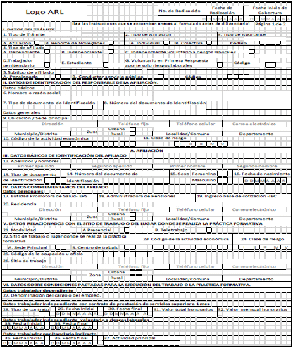 Fecha de radicación: Este dato corresponde a la fecha en que la Administradora de Riesgos Laborales ARL recibe físicamente el Formulario Único de Afiliación y Reporte de Novedades de trabajadores, contratistas y estudiantes al Sistema General de Riesgos Laborales, en dicha entidad.