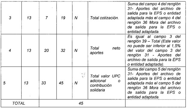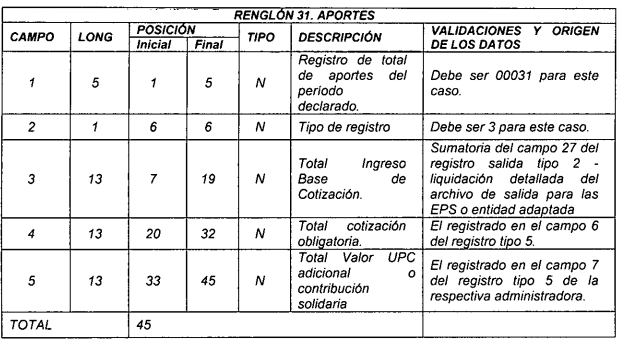 6 13 31 43 N Valor total cotizaciones obligatorias aportadas a esa EPS o entidad adaptada Sumatoria del campo 55 del registro tipo 2 del archivo tipo 2, para la EPS o entidad adaptada correspondiente.