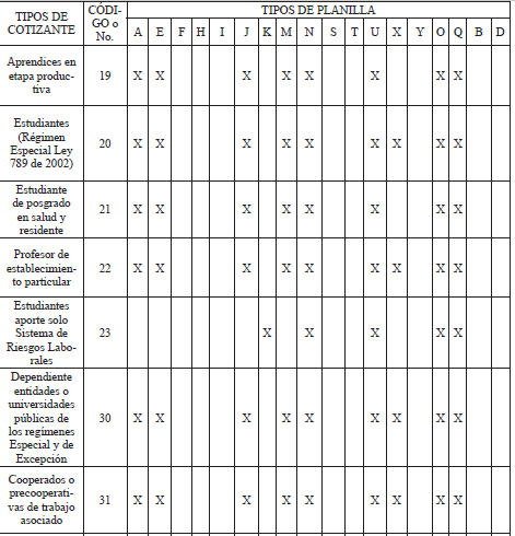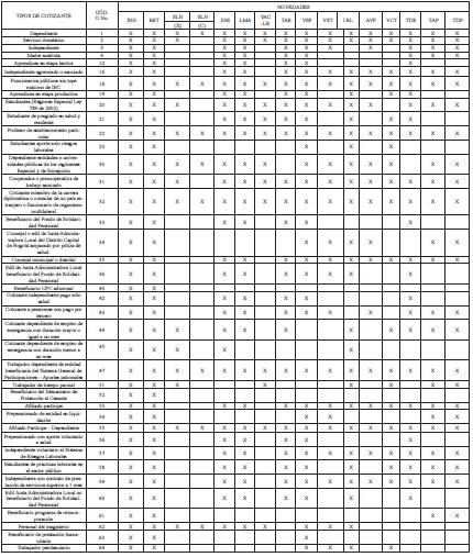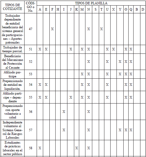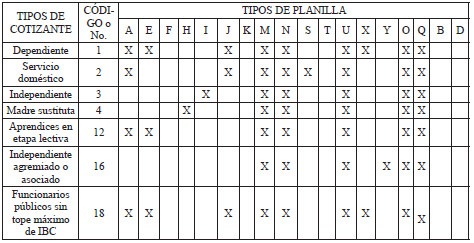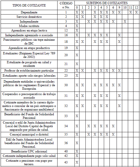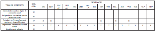 Código o No. Tipos de cotizantes