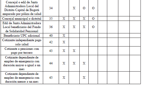 522627NObligatorio. Lo suministra el aportante. Los valores válidos son: 1. Dependiente. 2. Servicio doméstico. 3. Independiente. 4. Madre sustituta. 12. Aprendices en etapa lectiva. 16. Independiente agremiado o asociado. 18. Funcionarios públicos sin tope máximo en el IBC. 19. Aprendices en etapa productiva. 20. Estudiantes (Régimen especial- Ley 789/2002). 21. Estudiantes de posgrado en salud y residentes 22. Profesor de establecimiento particular. 23. Estudiantes aporte solo riesgos laborales 30. Dependiente entidades o universidades públicas de los regímenes Especial y de Excepción 31. Cooperados o precooperativas de trabajo asociado. 32. Cotizante miembro de la carrera diplomática o consular de un país extranjero o funcionario de organismo multilateral no sometido a la legislación colombiana. 33. Beneficiario del Fondo de Solidaridad Pensional. 34. Concejal o edil de Junta Administradora Local del Distrito Capital de Bogotá amparado por póliza de salud. 35. Concejal municipal o distrital. 36. Edil de Junta Administradora Local beneficiario del Fondo de Solidaridad Pensional 40. Beneficiario UPC Adicional 42. Cotizante independiente pago solo salud. 43. Cotizante a pensiones con pago por tercero. 44. Cotizante dependiente de empleo de emergencia con duración mayor o igual a un mes. 45. Cotizante dependiente de empleo de emergencia con duración menor a un mes. 47. Trabajador dependiente de entidad beneficiaria del Sistema General de Participaciones – Aportes Patronales. 51. Trabajador de tiempo parcial 52. Beneficiario del mecanismo de protección al cesante. 53. Afiliado participe 54. Prepensionado de entidad en liquidación. 55. Afiliado participe-dependiente. 56. Prepensionado con aporte voluntario a salud 57. Independiente voluntario al Sistema de Riesgos Laborales 58. Estudiantes de prácticas laborales en el sector público 59. Independiente con contrato de prestación de servicios superior a 1 mes 60. Edil Junta Administradora Local no beneficiario del Fondo de Solidaridad Pensional. 61. Beneficiario programa de reincorporación 62. Personal del Magisterio 63. Beneficiario de Prestación humanitaria 64. Trabajador penitenciario 65. Dependiente vinculado al Piso de Protección Social 66. Independiente vinculado al Piso de Protección Social 67. Voluntario en Primera Respuesta aporte solo al Sistema de Riesgos Laborales. 68. Dependiente Veterano de la Fuerza Pública 69. Contribuyente solidario