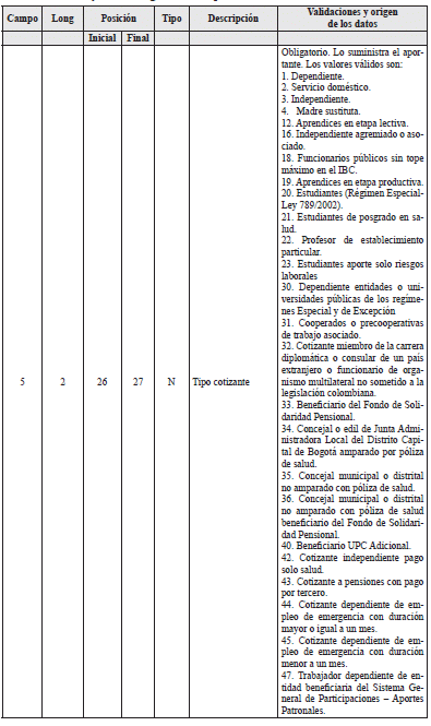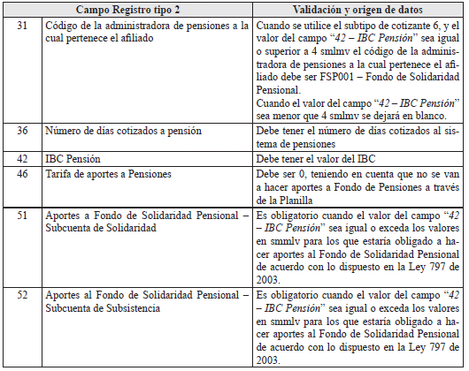 Es utilizado cuando el cotizante es un ciudadano extranjero que no está obligado a cotizar al Sistema General de Pensiones de acuerdo con la ley, pero debe cotizar a los demás sistemas, según el tipo de cotizante que corresponda. No deben diligenciar los campos 19, 20, 28, 31, 32, 36, 42, 46, 47, 48, 49, 50, 51, 52 y 53 del registro tipo 2 del archivo tipo 2.