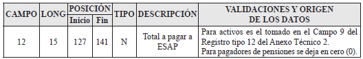 1. En el numeral 2.12.1 “Estructura de datos del registro de salida tipo 12. Total de la planilla” del Anexo Técnico 5 “Definición de los archivos de salida con destino al Ministerio de Salud y Protección Social” modificar las validaciones y origen de los datos del campo “12 – Total a pagar ESAP”, así: