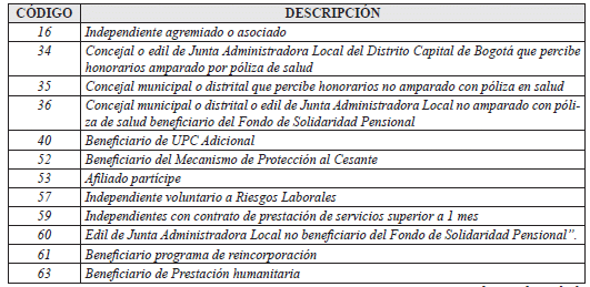 Los cotizantes tipo “16 - Independiente agremiado o asociado”, “34 - Concejal o edil de Junta Administradora Local del Distrito Capital de Bogotá amparado por póliza de salud”, “35 - Concejal municipal o distrital no amparado con póliza en salud”, “36 - Concejal municipal o distrital o edil de Junta Administradora Local no amparado con póliza de salud beneficiario del Fondo de Solidaridad Pensional”, “53 - Afiliado Partícipe”, “57 - Independiente voluntario a Riesgos Laborales”, “59 - Independientes con contrato de prestación de servicios superior a 1 mes” o “60 - Edil de Junta Administradora Local no beneficiario del Fondo de Solidaridad Pensional” podrán reportar a través de esta planilla sus beneficiarios vinculados mediante UPC adicional, esto es, cotizante tipo 40.
