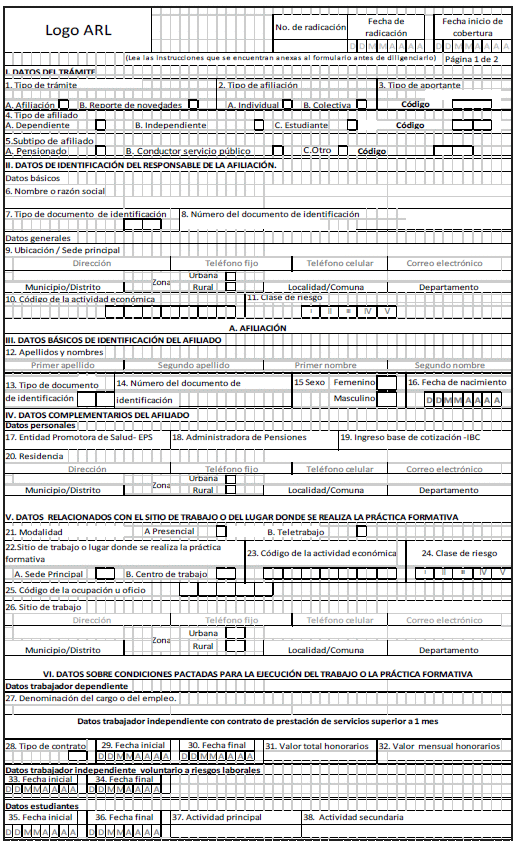 Fecha de radicación: Este dato corresponde a la fecha en que la Administradora de Riesgos Laborales (ARL) recibe físicamente el Formulario Único de Afiliación y Reporte de Novedades de trabajadores, contratistas y estudiantes al Sistema General de Riesgos Laborales, en dicha entidad.