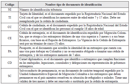 Tipo de documento de identificación: Registrar en el espacio el código que corresponde al documento con el cual se va a identificar, de acuerdo con las siguientes opciones: