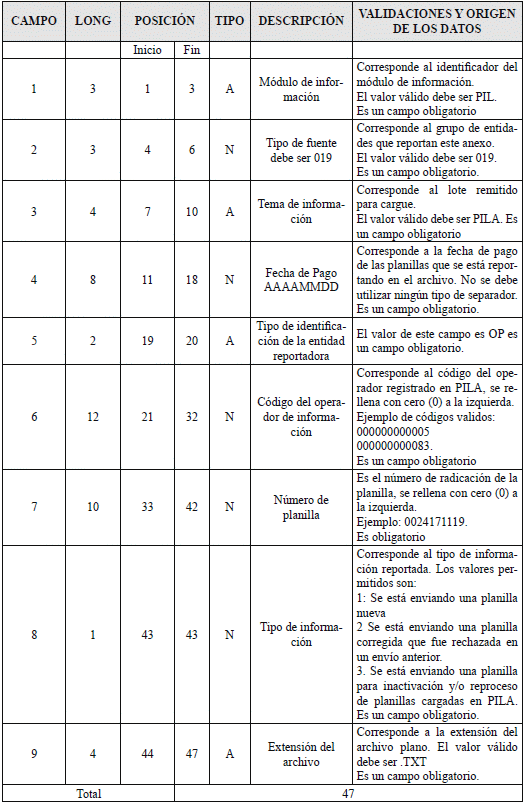 4. Si se omitió el pago de algún subsistema. Deberá realizar la corrección a través del mismo operador de información con el cual se liquidó la planilla inicial, en donde en el registro "A" el operador de información deberá cargar toda la información del Registro Tipo 2 de la planilla inicial y en el registro C reportará los valores que informó en la planilla inicial adicionando el o los sistemas que dejó de aportar en la planilla inicial. El operador de información solo enviará el archivo de salida a la administradora a la que se está ajustando la información de la planilla inicial.