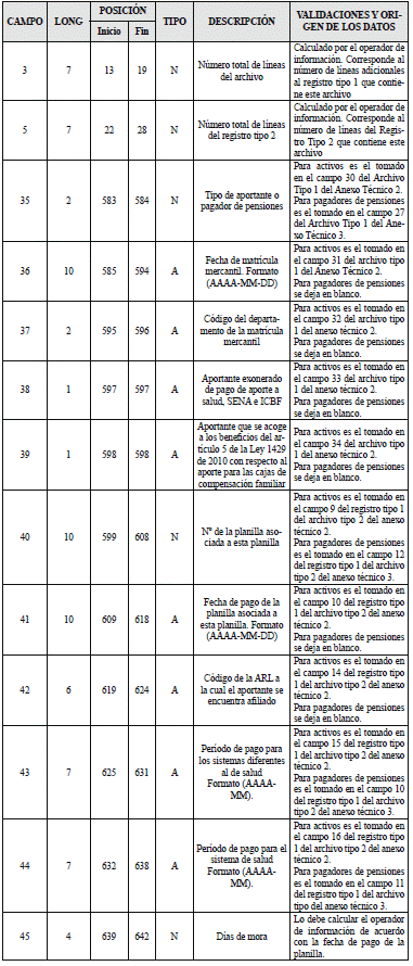 26. En el numeral 2.1.1 "Estructura de datos del Registro tipo 1. Encabezado del Archivo" del Anexo Técnico 5 "Definición de los archivos de salida con destino al Ministerio de Salud y Protección Social", modificar los nombres de los campos "3 – Número de registros del archivo" y "5 – Número de registros tipo 2 reportados en la planilla" y de modificar la longitud del campo "35 – Tipo de aportante o pagador de pensiones", así: