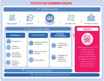 De acuerdo con el artículo 2.2.9.1.1.1. del Decreto 1078 de 2015 (DUR-TIC), la Política de Gobierno Digital, es entendida como el uso y aprovechamiento de las Tecnologías de la Información y las Comunicaciones, con el objetivo de impactar positivamente la calidad de vida de los ciudadanos y, en general, los habitantes del territorio nacional y la competitividad del país, promoviendo la generación de valor público a través de la transformación digital del Estado, de manera proactiva, confiable, articulada y colaborativa entre los Grupos de Interés y permitir el ejercicio de los derechos de los usuarios del ciberespacio.