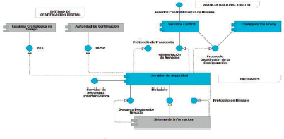 La Agencia Nacional Digital registra en el servidor central tantas autoridades de certificación como hayan autorizadas en el entorno nacional. El servidor central supervisa cuáles son las autoridades de confianza de certificados. El servidor que consume el servicio debe firmar cada petición. El servidor que ofrece el servicio recibe la petición y verifica la autenticidad.