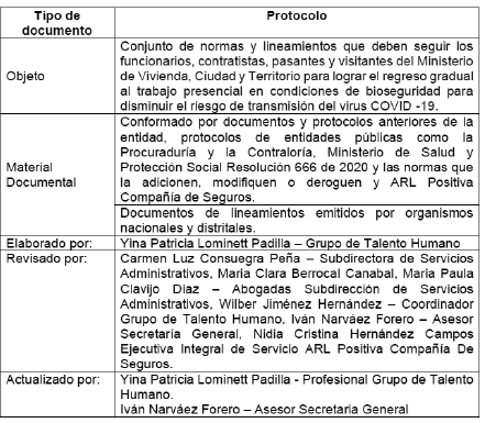 Los anexos que se relacionan en este protocolo los podrán consultar en la página del Ministerio, en la Intranet de la entidad, en caso de que lo requiera podrán ser solicitados mediante los siguientes correos ylominett@minvivineda.gov.co y