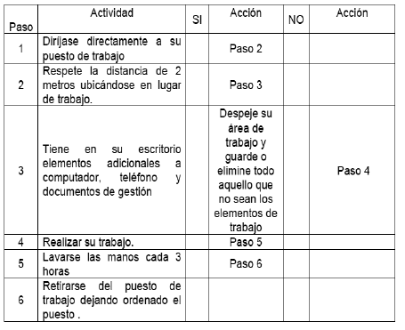 - Se realizará la limpieza de su puesto de trabajo y objetos utilizados con alcohol al 60% o el que haga sus veces (identificado en la ficha técnica identificada en matriz de productos químicos) y toalla destinada para este proceso, para lo cual el colaborador debe dejar su puesto totalmente despejado.
