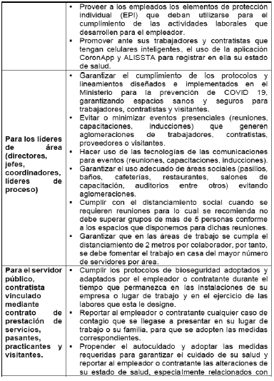 Así mismo, deberán cumplir con el Protocolo de Bioseguridad de comportamiento del ciudadano en el espacio público vigente, para la disminución del contagio en las actividades cotidianas expedido por el Ministerio de Salud y Protección Social, especialmente en lo referido al desplazamiento desde su domicilio hasta la sede donde presten sus servicios y todas las demás disposiciones que ha dispuesto el Gobierno Nacional para evitar la propagación del Coronavirus COVID-19.