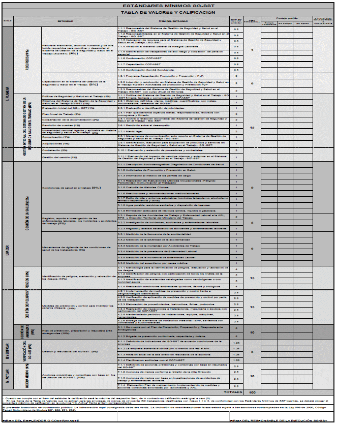 ARTÍCULO 27. TABLA DE VALORES DE LOS ESTÁNDARES MÍNIMOS. Para la calificación de cada uno de los ítems que componen los numerales de los Estándares Mínimos del Sistema de Gestión de SST, se tomará la tabla de valores que se presenta a continuación, en la cual se relacionan los porcentajes a asignar a cada uno.