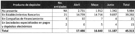 Que la información de productos de depósito, aportada por FOGAFIN permite identificar las entidades financieras donde los beneficiarios tenían un producto de depósito, con el siguiente detalle:
