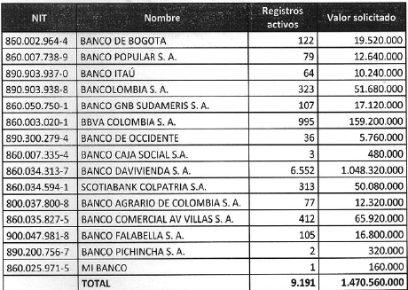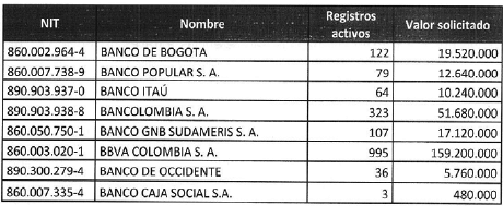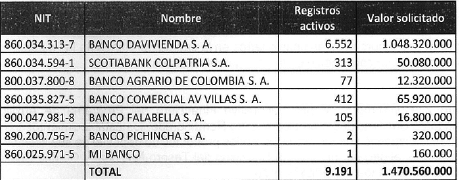 Que los establecimientos bancarios, una vez verificada la información de productos de depósito y teniendo en cuenta únicamente los activos, remitieron al Ministerio del Trabajo la solicitud de recursos con el siguiente detalle:
